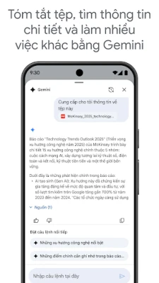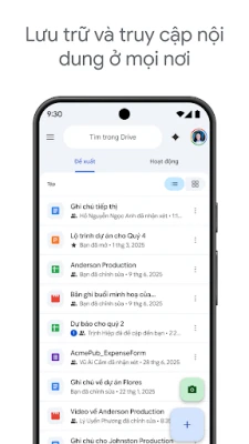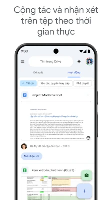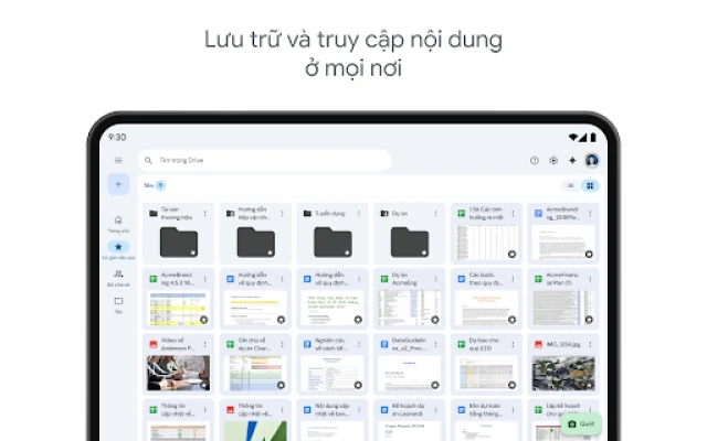 Không chỉ là nơi lưu trữ, Drive còn là trợ thủ đắc lực giúp bạn nâng cao năng suất. Bạn có thể dễ dàng biến tài liệu giấy thành định dạng số chỉ bằng cách quét chúng qua camera thiết bị. Tìm kiếm thông minh theo tên hoặc nội dung, cùng với các tùy chọn lọc nâng cao theo loại tệp hay ngày sửa đổi, giúp bạn định vị chính xác những gì mình cần trong tích tắc. Khả năng chia sẻ tệp và thư mục với quyền kiểm soát chặt chẽ, cùng với thông báo tức thì về mọi hoạt động quan trọng, đảm bảo quá trình làm việc nhóm luôn suôn sẻ. Thậm chí, bạn còn có thể xem và chỉnh sửa nội dung khi không có kết nối mạng, và tận hưởng trải nghiệm tối ưu trên máy tính bảng Android với chế độ xem cạnh nhau cùng thao tác kéo thả mượt mà.